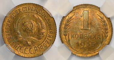 Лот 438 из 629. Копейка 1935 Старый тип. MS 64