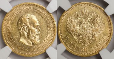 Лот 139 из 314. 5 рублей 1886 АГ AU 55