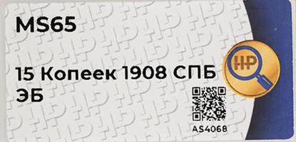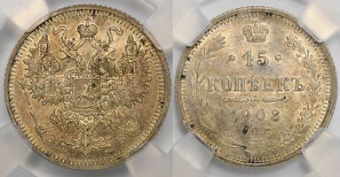 Лот 212 из 362. 15 копеек 1908 СПБ ЭБ MS 65