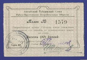 Алтайский Губернский Союз Рабоче-Крестьянских Потребительских Обществ, г. Барнаул. С оттиском печати общества и подписями ответственных лиц. XF