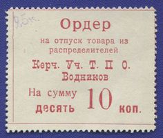 Керченское Участковое Транспортное Потребительское Общество Водников (работников черноморско-азовского округа морских путей сообщения). С оттиском печати общества на обороте. AU