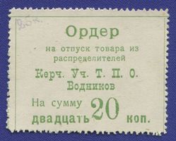Керченское Участковое Транспортное Потребительское Общество Водников (работников черноморско-азовского округа морских путей сообщения). С оттиском печати общества на обороте. AU