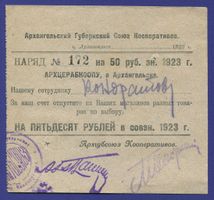 Архангельский Губернский Союз Кооперативов (АРХГУБСОЮЗ). С оттиском штампа правления и подписями ответственных лиц. XF-