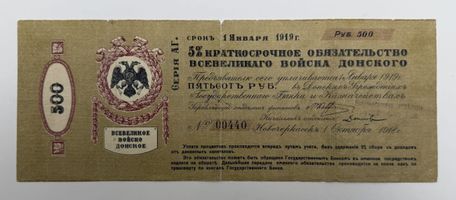 Всевеликое Войско Донское, г. Новочеркасск. 5 % Краткосрочное Обязательство. С оттиском штампа Новочеркасского отделения ГБ, срок 1 Октября. VF-