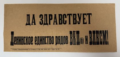 Агитационная листовка. «Да здравствует Ленинское единство рядов ВКП(б) и ВЛКСМ!» Пермь. 1926 г. 1-я типография «Пермпромкомбината». XF-AU