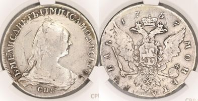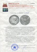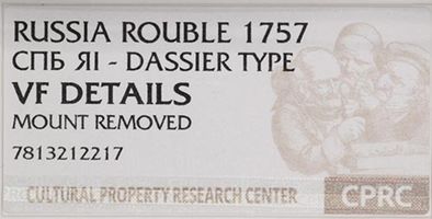 Очень редка монета. Портрет работы Ж.Дасье. Узденников - черта с точкой. 15 рублей по Ильину, 25 рублей по Петрову. Биткин № 282. Редкость R1. Экспертиза. В слабе CPRC VF Details