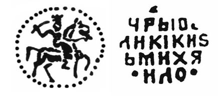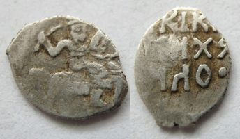 Денга. г. Москва. Л.с.: Всадник в короне с саблей. O.с.: ЧРЫ I BE / ЛИКІ KHS / Ь МИХЯ / *ИЛО* (Царь и Великий князь Михаил). ГП №674.