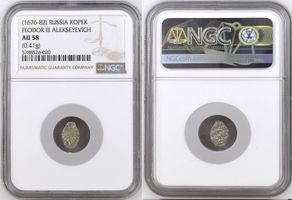 NGC AU58 5788526-020. По официальной статистике компании NGC, только 1 экземпляр имеет более высокую оценку степени сохранности. Копейка о/М, 1677 г. "Царь и Великий Князь Фёдор Алексеевич Всея Руси".