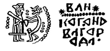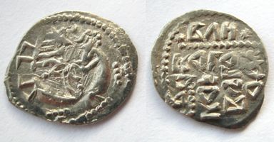 Новгородская республика, 1420-1478 гг… Денга "С точками", ранний выпуск 1420-1447 гг… Л.с.: Святая София (символ государственности) слева; сцена оммажа; справа проситель с даром в форме овала, по бокам и между фигурами точки. О.с.: *ВЛН* /черта из точек / КОГ.О НО / ВАГОР / ОДА. (Великого Новгорода). Гришин-Петрунин 105, лиц.шт. 37, об.шт. 158; 2017 г.