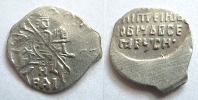 AU+/UNC. Русское царство. Дмитрий Иванович (Лжедмитрий I, Григорий Отрепьев) 7 июля 1605 - 17 мая 1606 гг.. Л.с.: Всадник с копьём, под конём буквы Н/РАI. O.с.: ЦРЬ І B* / ЕЛІКІ КHSЬ / ДМИТРЕ IBA / НОВІЧЬ ВСЕ / А РУСІ** (Царь и Великий князь Дмитрий Иванович Всея Руси). ГП №248