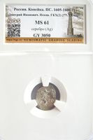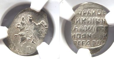 MS61. Русское царство. Дмитрий Иванович, 7 июля 1605 г. - 17 мая 1606 г. (Лжедмитрий, Григорий Отрепьев). Л.с.: Архаичный всадник, буквы ПС под конём. О.с.: Царь и Великий князь Дмитрий Иванович Всея Руси. ГП #245. ГП #245.