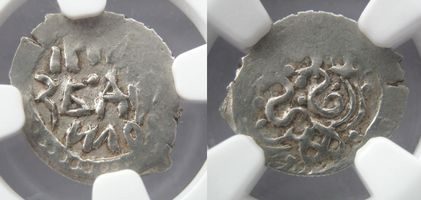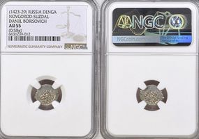 NGC AU55. Денга ок. 1411-1415 гг., Нижний Новгород. Л.с.: КНА / ZЬ ДАN / ИЛО (Князь Данило) О.с.: Подражание дирхему хана Бердибека, в картуше с 4-мя «узлами счастья»: Чекан Булгара. Тростьянский 2009 #1.1-1.15, Гулецкий-Петрунин 2017 #1900
