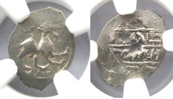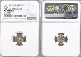NGC AU Details. Л.с.: Четвероногое вправо, с хвостом между ног, оканчивающийся трилистником. О.с.: "Печать князя Великого Михаила".. Зверь с поднятым хвостом, на конце лилия // Печать князя Великого Михаила. Гришин-Петрунин #2857.