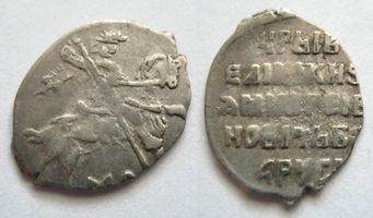Редкая ! AU/AU+. Всадник с ликом. Копейка МО, г. Москва. Л.с.: Всадник с копьём, под конём буквы МО. O.с.: ЦРЬ І B* / ЕЛІКІ KHSЬ / ДМИТРЕ ІBA / НОВІЧЬ ВСЕ / А РУСІ** (Царь и Великий князь Дмитрий Иванович Всея Руси). ГП №242.