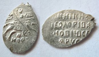 AU+/UNC. Штемпельный блеск, отличная центровка; всадник с ликом.Копейка вНОРЕ (1597 г.), г. Новгород. Л.с.: Всадник с копьём. О.с.: Царь и Великий князь Фёдор Иванович Всея Руси.