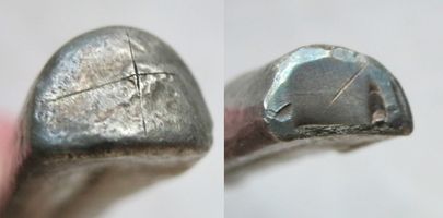 UNC. Отлично сохранившийся экземпляр. 8 наклонных насечек и одна поперечная. На краю латинская буква "S". С торцов крестообразные насечки.