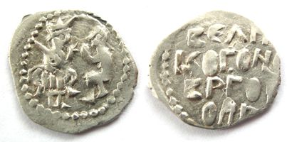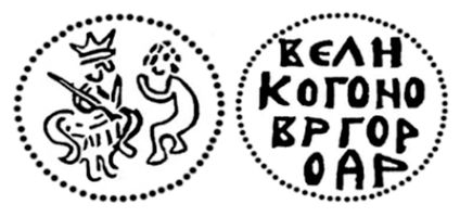 AU+/UNC. Полный бусовый ободок, отличная центровка. Минимальные следы обращения. Денга, пореформенный выпуск, 1447-1470 гг… Л.с.: Святая София (символ государственности) на троне, справа проситель; без даров и знаков. O.с.: ВЕЛН // КОГОNO // ВГОР // ОАР (Великого Новгорода). Толстой 1884 #417, лиц. шт. #156, об.шт. #10, Гришин-Храменков 2016 #16, Гришин-Петрунин 2017 #3002 AA.