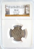 MS63 - Топ-Грейд ! Румский султанат (династия Сельджуков), Кай Хусрав III (1265-1283). Динар АН 663-682 (1265-1283), г. Конья (совр. Анатолия, Турция). Л.с.: в центре 6-ти угольного картуша: Аль-Малик Аллах «Владычество Бога» // Чеканен в городе (Конья). O.с.: Внутри бисерного кольца титулатура султана: Аль-Султан Аль-Азим Гайат ад-дунья ва И-дин Абу'л-Фатх Кай Хусрав ибн Килидж Арслан: (Султан Величайший Помощник в этом мире и в будущей жизни, Отец Веры, Кай Хусрав, сын Кылыдж Арслана). AR 23-24 мм. ок. 3.00 г. A# 1232