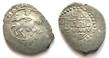 AU+/UNC. Штемпельный блеск. Отличная центровка. Денга, чеканка 1425-1446 г.. Л.с.: Всадник с соколом, по кругу: "Кнаzь великиі Василеи". О.с.: подражание арабской надписи.
