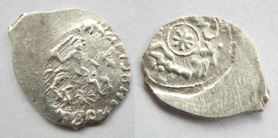 UNC. Штемпельный блеск. Очень редка в высокой степени сохранности. Денга, ~1468~1473 гг…, Московский денежный двор. Л.с.: Всадник с саблей, под конем цветочная розетка. По-кругу: КHZЬВЕЛИКИИВАНЪВАСИЬВИ. O.с.: В центре 8-ми лучевая звезда; круговая арабская надпись: "Это московское акче". ГП 2017 № 8010 А; Орешников А.В., 1896. № 649. табл. XI. рис. 496. Помещение на обратной стороне арабской легенды было связано с возобновлением выплаты дани Золотой Орде. В 1467 году к власти в Большой Орде пришёл хан Ахмат, которому удалось на некоторое время объединить государство и укрепить центральную власть. Иван III, дабы сохранить нейтралитет Золотой Орде, вынужден был поместить на монетах символ зависимости - арабскую надпись.