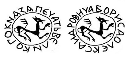 AU. Штемпельный блеск. Л.с.: четвероногое с поднятым хвостом вправо, ПЕЧАТЬ ВЕЛИКОГО КНЯЗЯ. О.с.: БОРИС ОЛЕКСАНДРОВИЧ