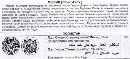 MS63. Султан Справедливый Мюрид хан Да продлится его правление / Чекан Гюлистана год 732. Сагдеева 313. Френ 150. Мюрид (763-764 гг.х.), брат Хызра. После столкновения с Кильдибеком Мюрид закрепляется на левобережье Волги. Раздел Золотой Орды происходит по Волге на левобережную часть (орда Мюрида) и правобережье, включая Крым (орда Мамая).