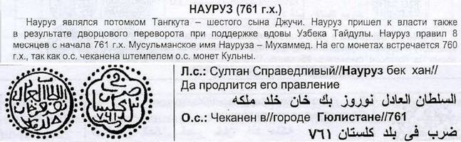 Султан Справедливый Науруз бек хан, да продлится его правление / чеканен в городе Гюлистан 761. Сагдеева 291. Фёдоров-Давыдов IV 192. Науруз пришел к власти также в результате дворцового переворота при поддержке вдовы Узбека Тайдулы. Правил 8 месяцев с начала 761 г.х.