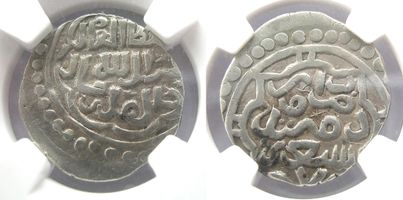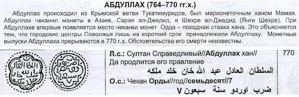AU58. Султан Справедливый Абдуллах хан Да продлится его правление // Чекан Орды год семьдесят 7. (=770). Сагдеева 339. Савельев 70. Абдуллах происходил из Крымской ветви Тукатимуридов, был марионеточным ханом Мамая. Монетные выпуски Абдуллаха прерываются в 770 г.х. Обстоятельства его смерти неизвестны.