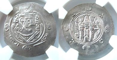 MS63. Бюст, имитирующий Хусру II, в крылатой короне, по сторонам: «пусть его слава возрастет», выражение похвалы (хорошо/отлично), дата Пехлеви «APD»; знак монетного двора // Алтарь огня в сасанидском стиле с двумя служителями с мечами, полумесяцами со звездами. Zeno 283943. Album 73; Walker, Arab-Sasanian, 307. MAC 1339-1341.