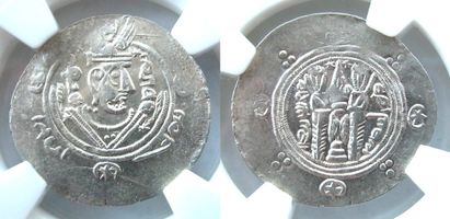MS63. Бюст, имитирующий Хусру II, в крылатой короне, по сторонам: «пусть его слава возрастет», выражение похвалы (хорошо/отлично), дата Пехлеви «APD»; знак монетного двора // Алтарь огня в сасанидском стиле с двумя служителями с мечами, полумесяцами со звездами. Zeno 283943. Album 73; Walker, Arab-Sasanian, 307. MAC 1339-1341.