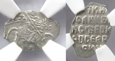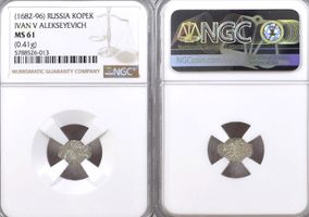 NGC MS61 5788526-013 По официальной статистике компании NGC, только 2 экземпляра имеют более высокую оценку степени сохранности. Иван V Алексеевич Романов, 1682-1696 гг.. Копейка "о/М". "Царь и Великий Князь Иван Алексеевич Всея Руси"