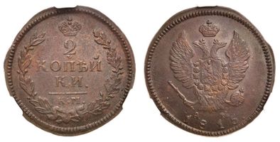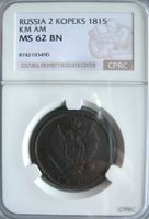 2 копейки 1815 КМ АМ CPRC MS 62 BN