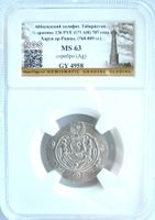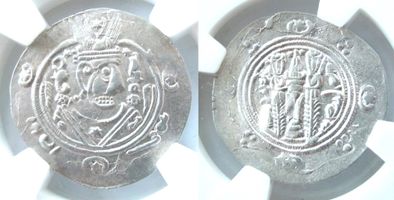 MS 63. Табариста́н — средневековое (IX—XII века) название провинции, расположенной на южном побережье Каспийского моря (нынешняя территория Ирана). Бюст, имитирующий Хусру II, в крылатой короне, по сторонам: «пусть его слава возрастет», выражение похвалы (хорошо/отлично), дата Пехлеви «APD»; знак монетного двора // Алтарь огня в сасанидском стиле с двумя служителями с мечами, полумесяцами со звездами. Zeno 283943. Album 73; Walker, Arab-Sasanian, 307. MAC 1339-1341.