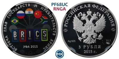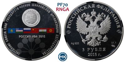 Монеты в слабе RNGA. 3 рубля 2015 года "ШОС" PF 70 UC. 3 рубля 2015 года "БРИКС" PF 68 UC.