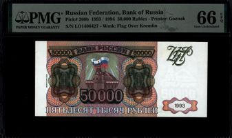 Серия ЛО 1406427 . Водяной знак Силуэт Сенатской башни Московского Кремля. Ниже цифры номинала 50000.. PICK P-260b