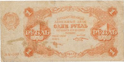 Государственный Денежный Знак 1 рубль 1922 года, АА-009, с подписью НКФ Крестинского, кассир Козлов. Сохранность очень хорошая. Кардаков# I.4.246. Денисов# КЗ-25. Рябченко# 1258.