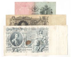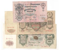 25-100-500 Рублей 1909-1912 Российская Империя P# 12-14. Подписи: Шипов - кассиры разные. Разной степени сохранности.
