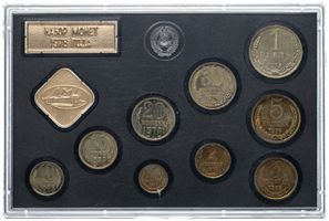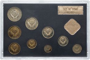 Годовой набор монет улучшенного качества Государственного Банка СССР 1978 года, ЛМД. 1 рубль, 50 копеек, 20 копеек, 15 копеек, 10 копеек. Медно-никелевый сплав. 5 копеек, 3 копейки, 2 копейки, 1 копейка. Медно-цинковый сплав. Жесткий пластик, пластмассовый трафарет черного цвета, с ромбовидным жетоном ЛМД и годовой плашкой из алюминия. Сохранность очень хорошая, пятна коррозии. Петров, Федорин# # 364, 366, 367, 368, 371, 372, 374, 376, 377. Набор вложен в оригинальную картонную коробку оливкового цвета.