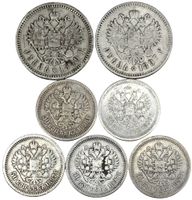 Лот серебряных монет правления Николая II. Состав лота : 2 рубля / 5 штук 50 копеек. Сохранность удовлетворительная.