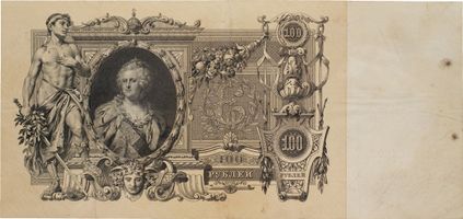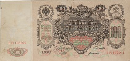 Государственный Кредитный Билет 100 рублей 1910 года,ММ 199700. Подписи: управляющий И. Шипов, кассир Чихиржин. Сохранность очень хорошая. Кардаков# I.1.713. Денисов# К-36.2в.