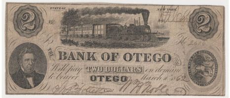 2 доллара 1862 Нью-Йорк Отего Банк.Obsolete note. Хорошая сохранность.