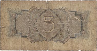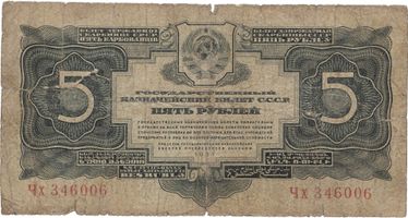 Государственный Казначейский Билет 5 рублей 1934 года,Чх 346006. Второй выпуск, без подписи Наркомфина Гринько. Сохранность хорошая. Кардаков# I.4.328. Денисов# КБ-18. Рябченко# 1354а.